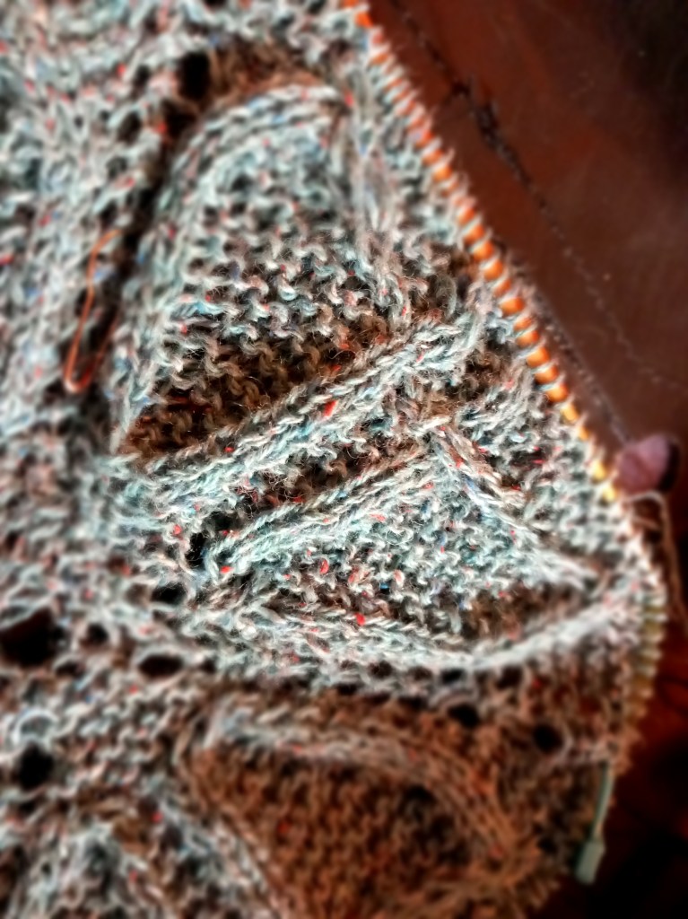 So it is with this shawl. It’s beautiful, all celtic knots made of delicate cables in 3 ply yarn.