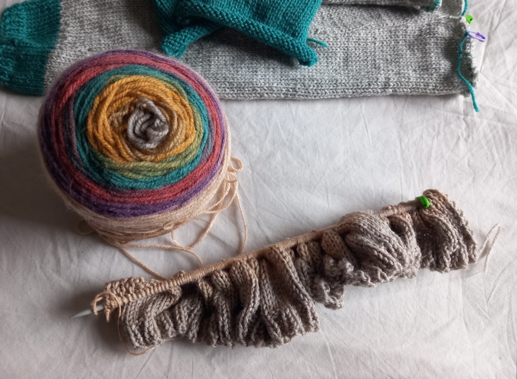 That only used one cake, and having worked with the yarn and seen its stripes, I thought I’d do a long length cardigan, with Warlock at the bottom and a solid shade on the top and sleeves.
