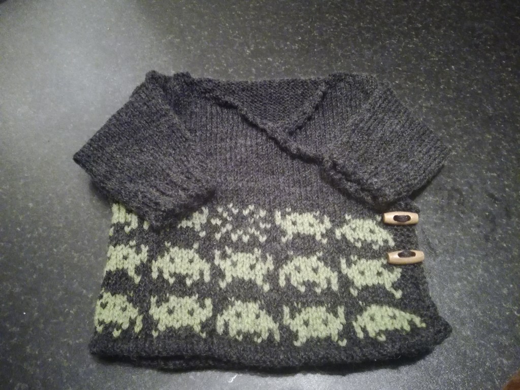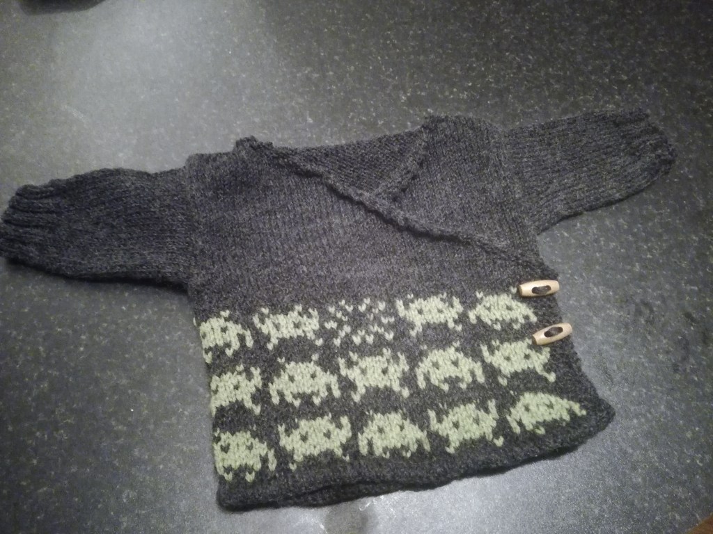 The original is Invading Your Earspace (Ravelry link) by Catherine Paul. I combined it with the Garter Stitch Baby Cardigan (Ravelry link) by Joji Locatelli (designer’s site) except I made it a stockinette baby cardigan to allow for the pattern. I didn’t realise who wrote this pattern until now! I had no idea who any designers were until the last couple of years, but now I know that she’s a Big Deal.