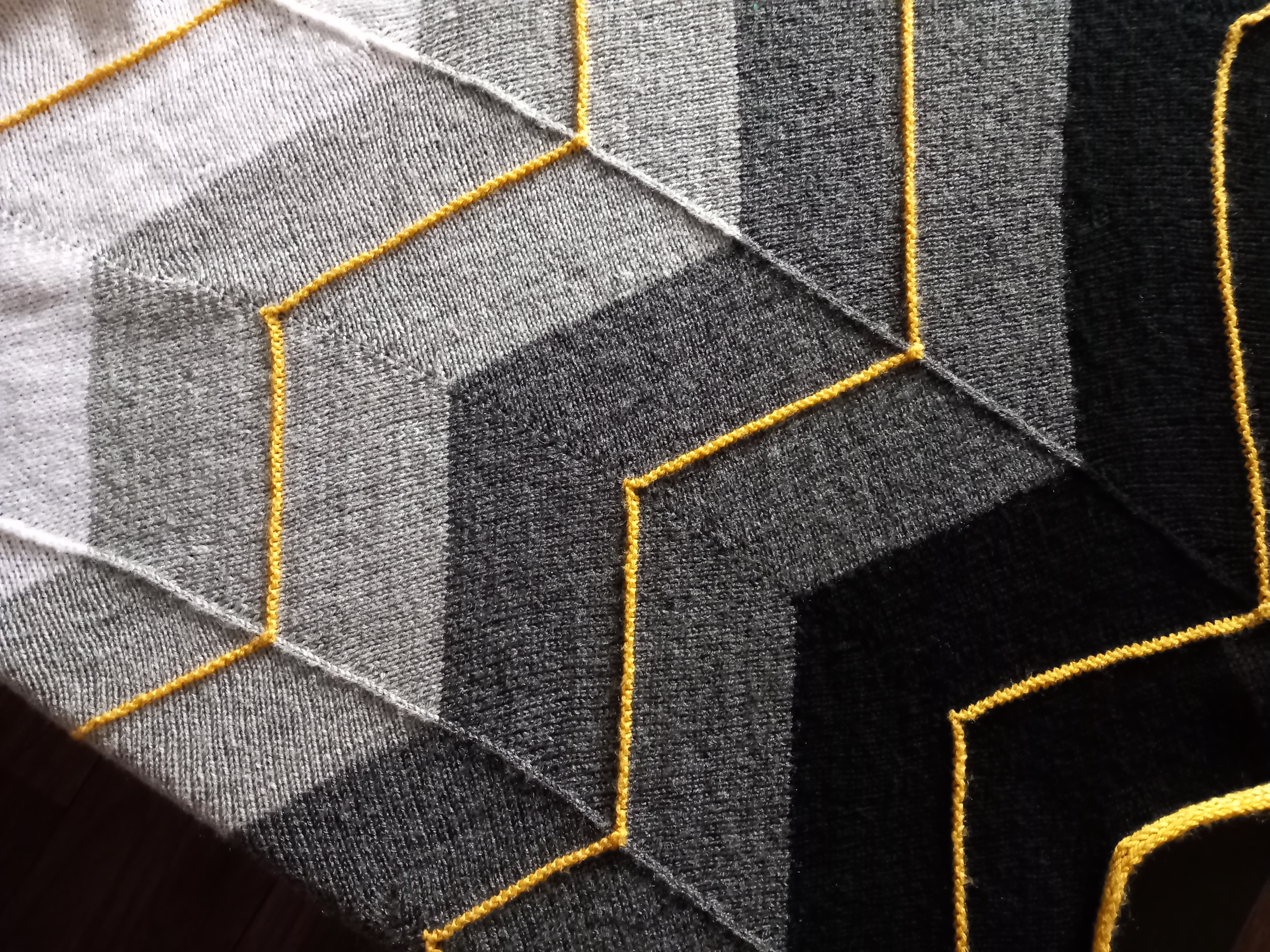 Anyway, off I went and bought the pattern (Ravelry link) by Grace Anna Farrow (designer’s site). Then I headed over to the Katia website and after some deliberation bought some Promo Fin in white, black and two shades of grey. Which two shades? No idea – I actually ordered four and only used two of them, which is part of the reason I have so much grey in stash. It was a very inexpensive option, pleasant to knit with, and soaked/blocked up nice and soft.
