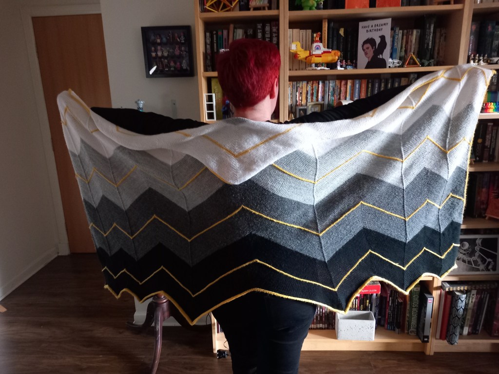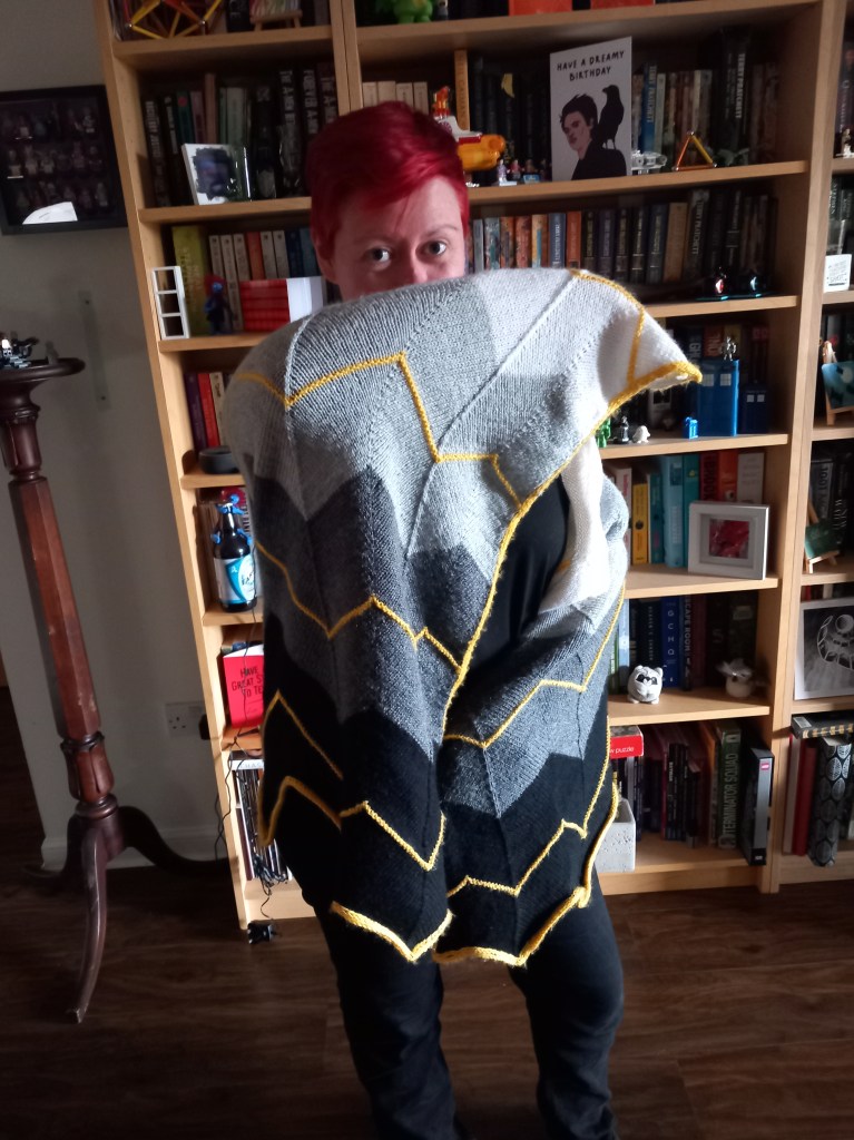 The yarn was a considerably heavier weight than the pattern calls for and I do have a slight regret on that front. It’s a sport weight and if I were to make another Volt (which isn’t out of the question) I’d get a light fingering weight as suggested. The sport gave me a heavier, very cosy shawl which I do wear often, but lacks some of the elegance of a finer knit.