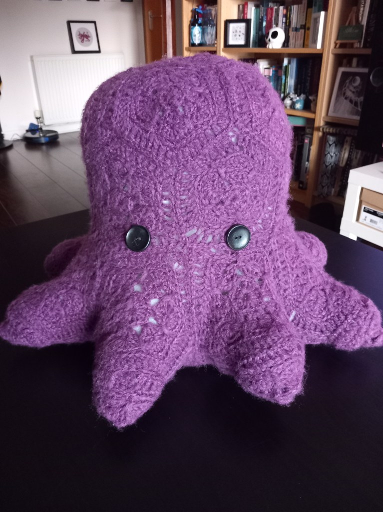 Darren is made from the same pattern as the super cute octopus that I use for a profile pic. I used a heavier, fuzzy yarn (Stylecraft Cosy Delight Chunky – I have 5.5 skeins to sell if you’re looking for some!) and a bigger hook. Placing the eyes was more of a challenge, he looks a little gormless but this was the best option.