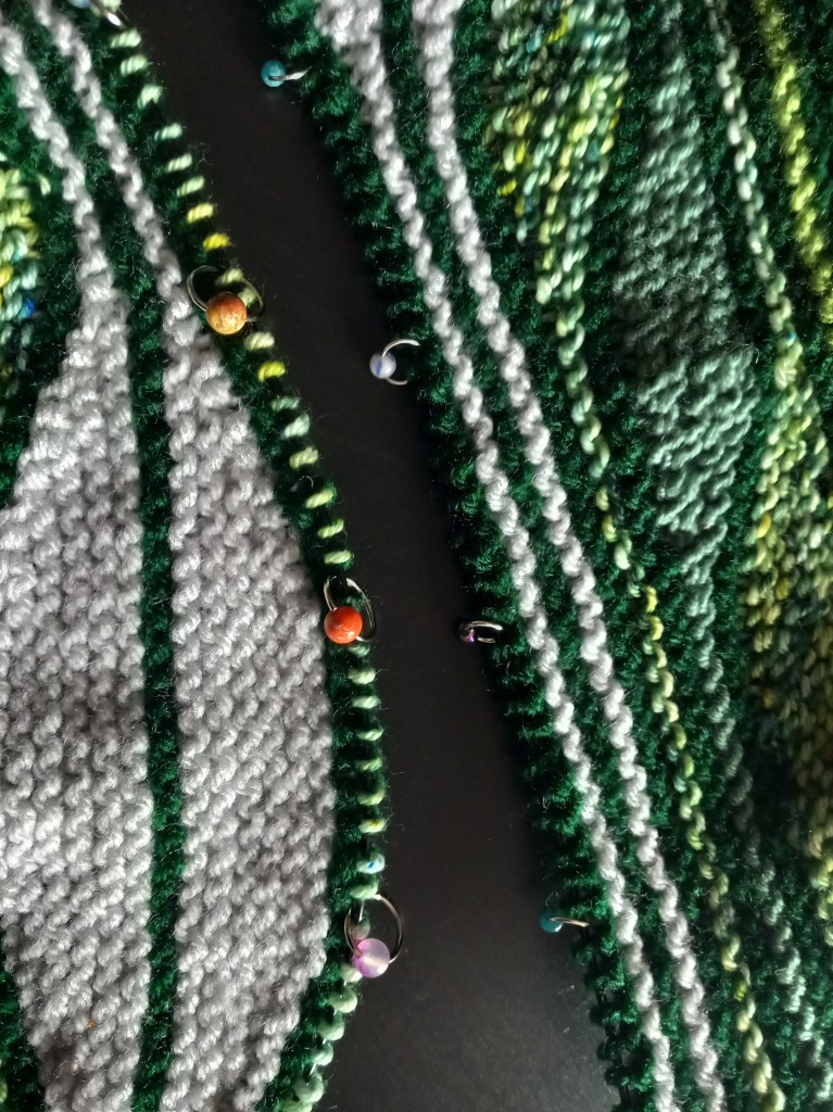 These were great for the 3.25mm needles Wingspan used. I also made beaded markers in the same size, and started out using them on the Topographical Scarf which is on 4mm needles. They’re a bit neat and sometimes trap the yarn under them, so I went to nice big jump rings that feel good for, at a guess, up to 6mm needles. These are also more robust rings so hopefully less chance of being bent out of shape over time (or by an accidental twist of the needle).