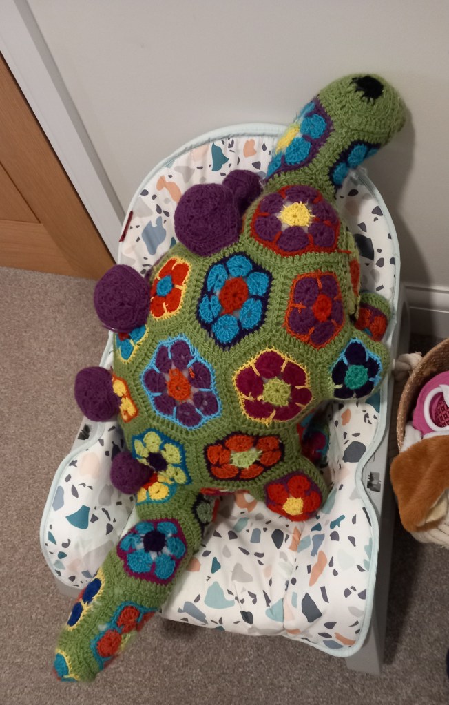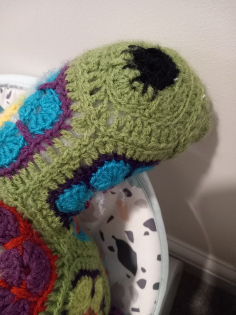 This is Mummy Dinosaur, and she’s been here for six months. She’s less tired than Dragony but already you can see an end or two waving at us (even though they were well woven in!) and some stuffing popping out here and there.