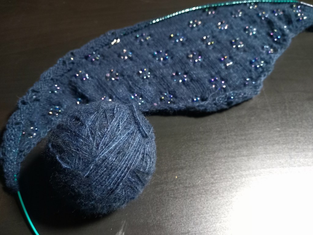 It’s pleasantly mind-occupying, and I’m just getting the hang of the pattern without looking at every stitch. The yarn is a navy mix – excuse the poor photos! Winter lighting has a lot to answer for.