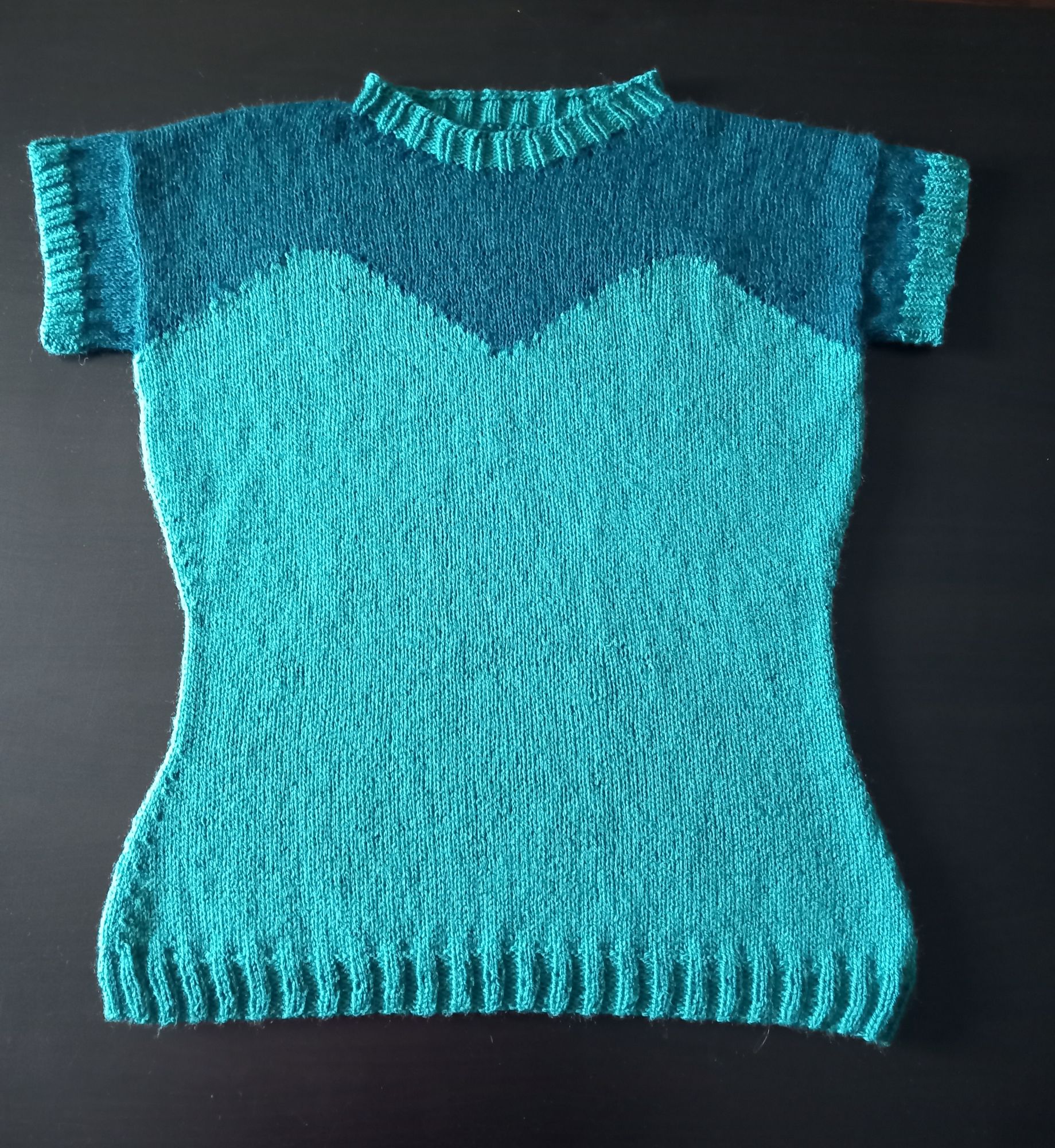 As a reminder, this is the As If Tee Lite (Ravelry link) by Shay Johnson (designer’s site). I added waist shaping, sleeves, and a short row neckline. I used 111g of Papatya Love and 27g of Katia Sweet Lace.