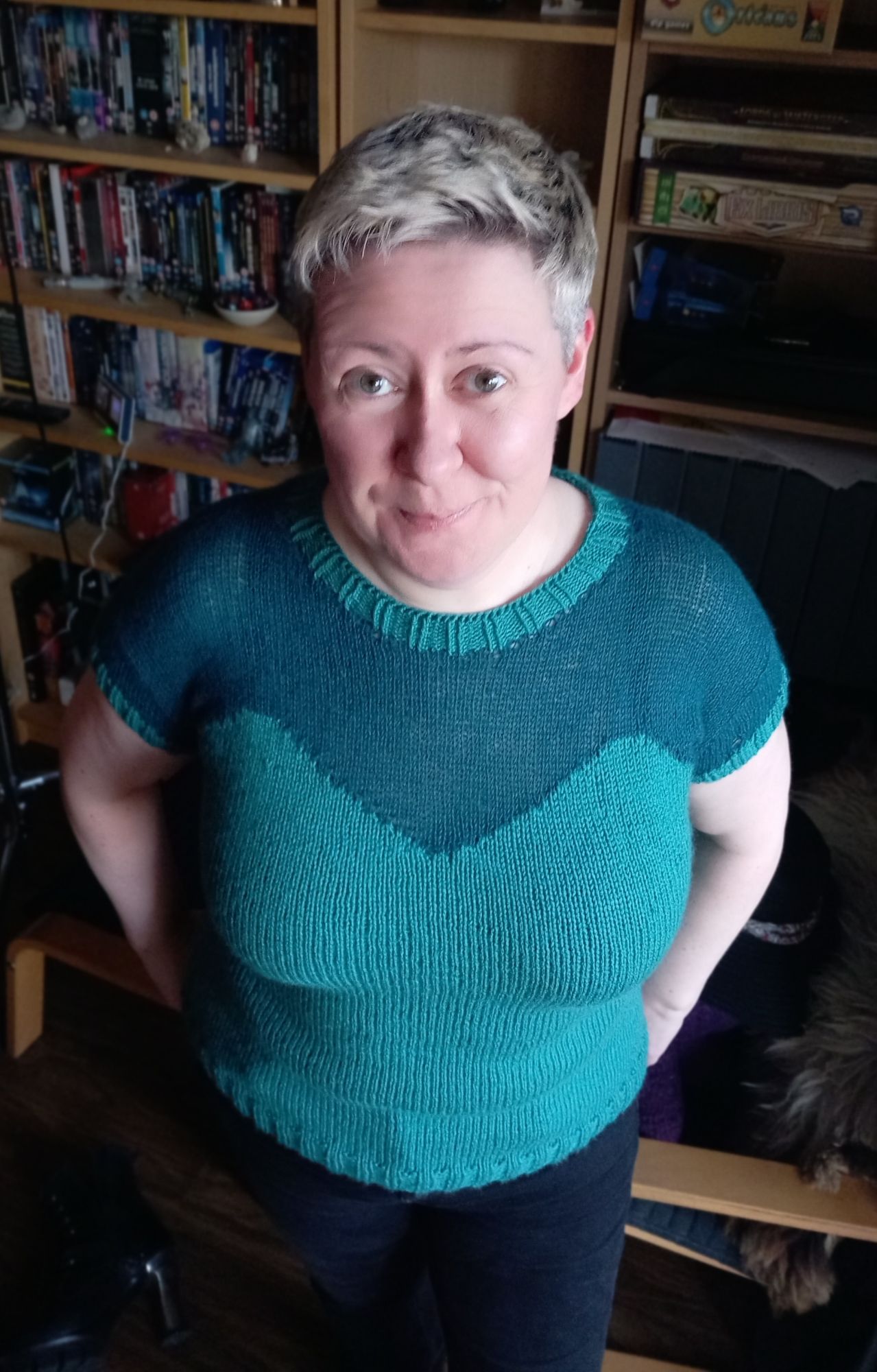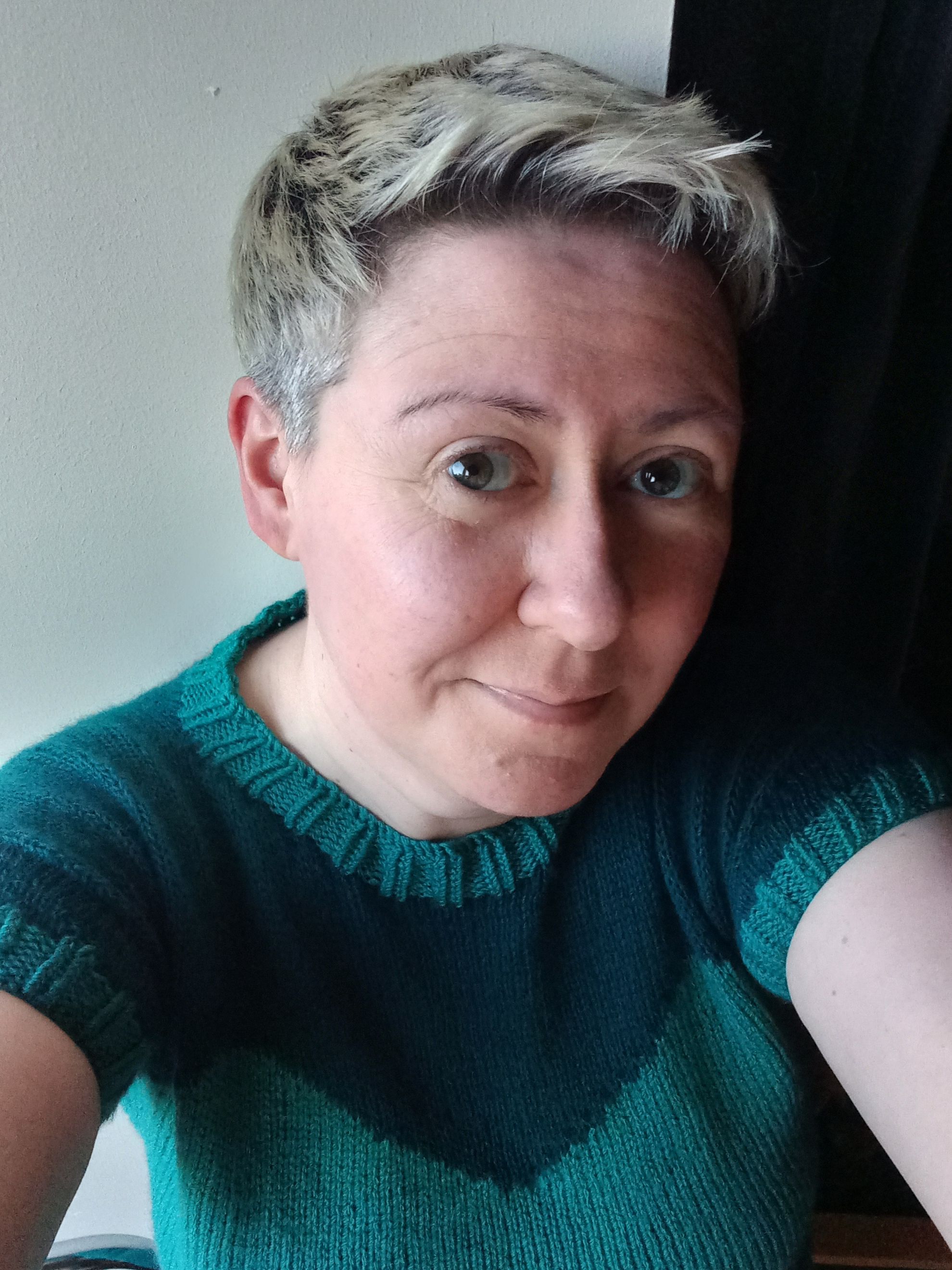 I feel really accomplished with this garment. I made quite a few successful amendments. I chose to shape the neckline with short rows – I didn’t even write down the plan, I just did it on the hoof (while watching 90s classic Speed) and it turned out just how I wanted. Well… I did think that I might have made too many rows in the front after it was done. I could see the front was now a little higher than the back. Instead of adding more length and then seaming, I grafted front and back together. I figured that would let the top find its equilibrium over my shoulders, without a visible seam to make it look off-balance.
