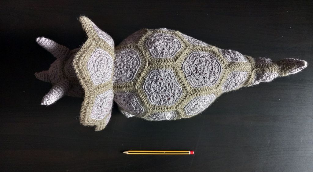 As other makers have noted, I had trouble following the pattern’s directions for the horns, and ended up freestyling those. I used buttons for eyes instead of wooly ones, so if I end up gifting the triceratops it’ll need to be to someone old enough not to eat buttons. She came out at about 20 inches from tip of horn to tip of tail, and about 10 inches from ground to highest point of frill. That’s just over one and a half times as big as if I’d used finer yarn (based on the pattern’s predicted size).