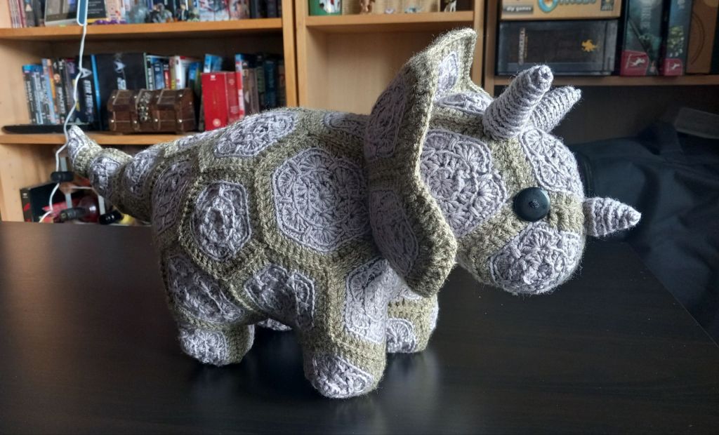 This is Plod the African Flower Triceratops (Ravelry link) by Heidi Bears (Etsy link). I used DK yarn: Sublime Extra Fine Merino DK in grey, 125g, and Sirdar Hayfield Bonus DK in Stone Marl, 65g. I used a 1.75mm crochet hook.