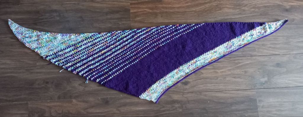 I had 46g of the speckled skein left at the point where the pattern is finished using it – so I went ahead and added a stripe to the end, to use it up. I saved some of the purple for the final bind off; I read that another knitter used 7g for the bind off, and I allowed 12g as I knew my shawl was bigger than the pattern. In the end I only needed 5g, but better safe than sorry!