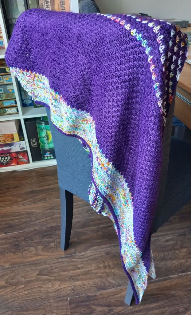 This is Texture (Ravelry link) by Helen Kennedy (designer’s Insta). I used 100g of DK merino by Dina’s Home of Crafts, 93g of Stylecraft Special DK, and a 4mm needle. I made it in three days, and I added some extra rows in purple, then an extra stripe in the variegated yarn. My final row was 171 stitches wide and I needed 5g of yarn for the i-cord bind off.