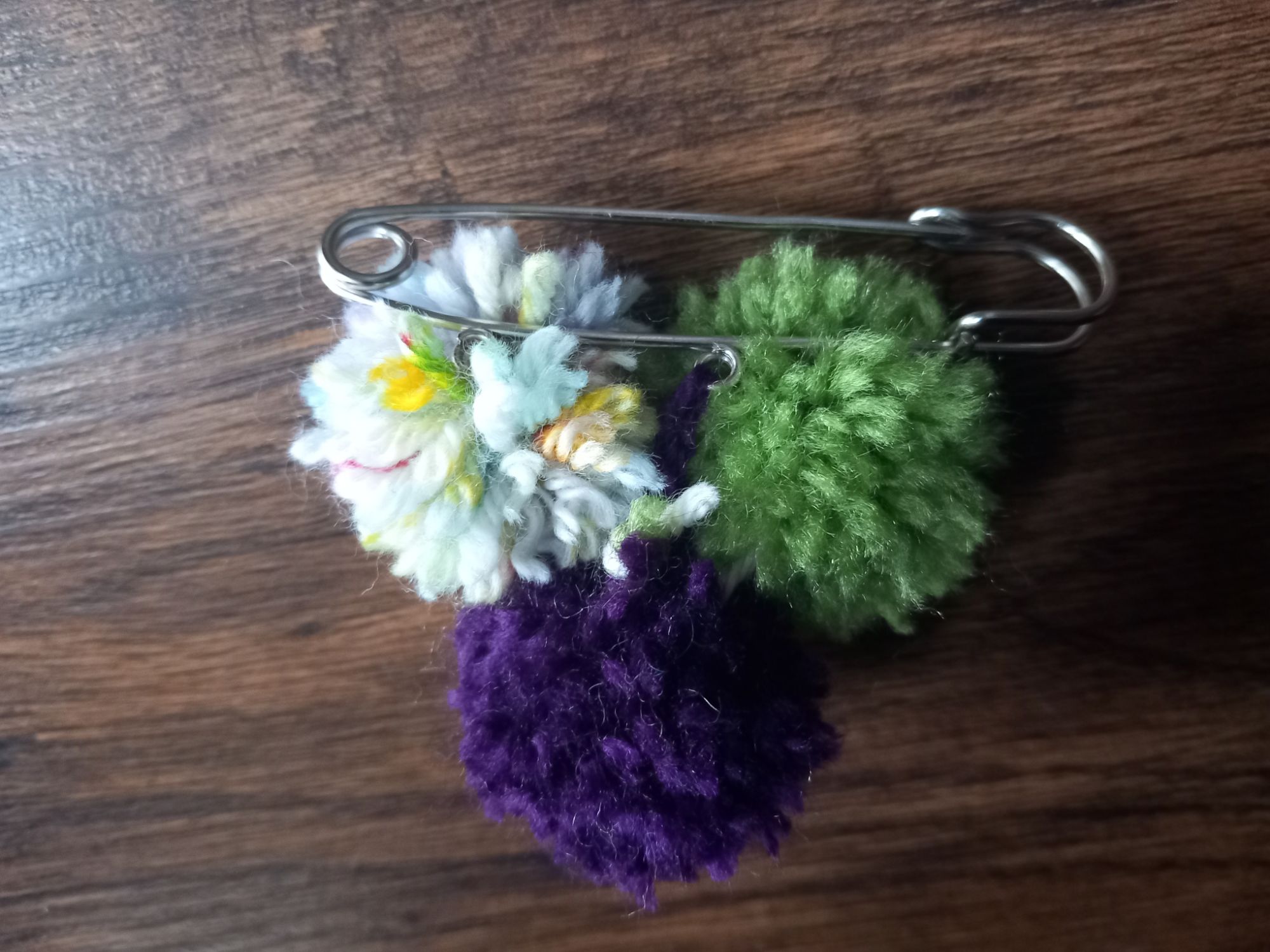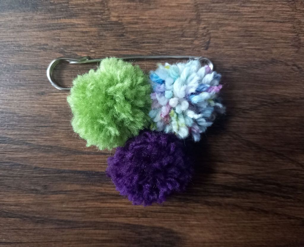 I found I got a better result using thread to secure the middle, though it was very challenging to pull it tight enough without it breaking. Once I had three pom poms, I threaded them on to a blanket/kilt pin, then kind of sewed them to each other in a freestyle way. Not haphazard. Freestyle.