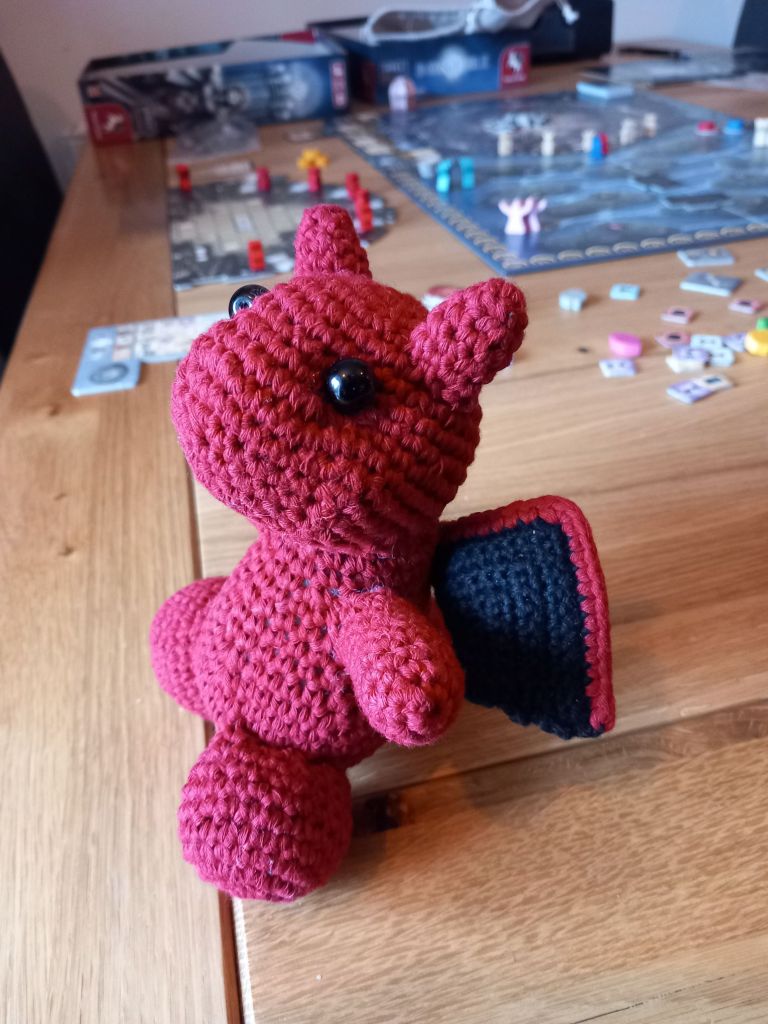 He was made to the same pattern as this dragon friend… except not. Once again I made him sitting up, not lying down as per the pattern. I also added an extra increase (and corresponding decrease) row to his head and body to make him a bit bigger.