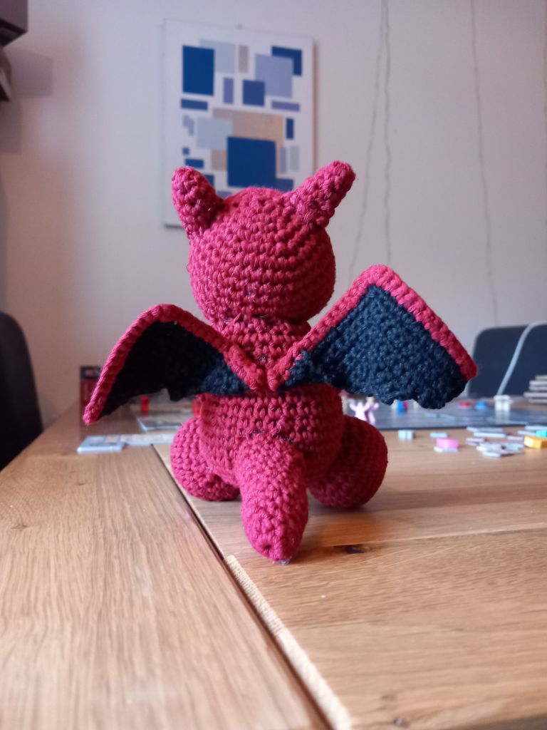 This is a modified Baby Dragon Amigurumi (Ravelry link) by Lily Columbe (designer’s Facebook). The direct link to the original pattern is here.
