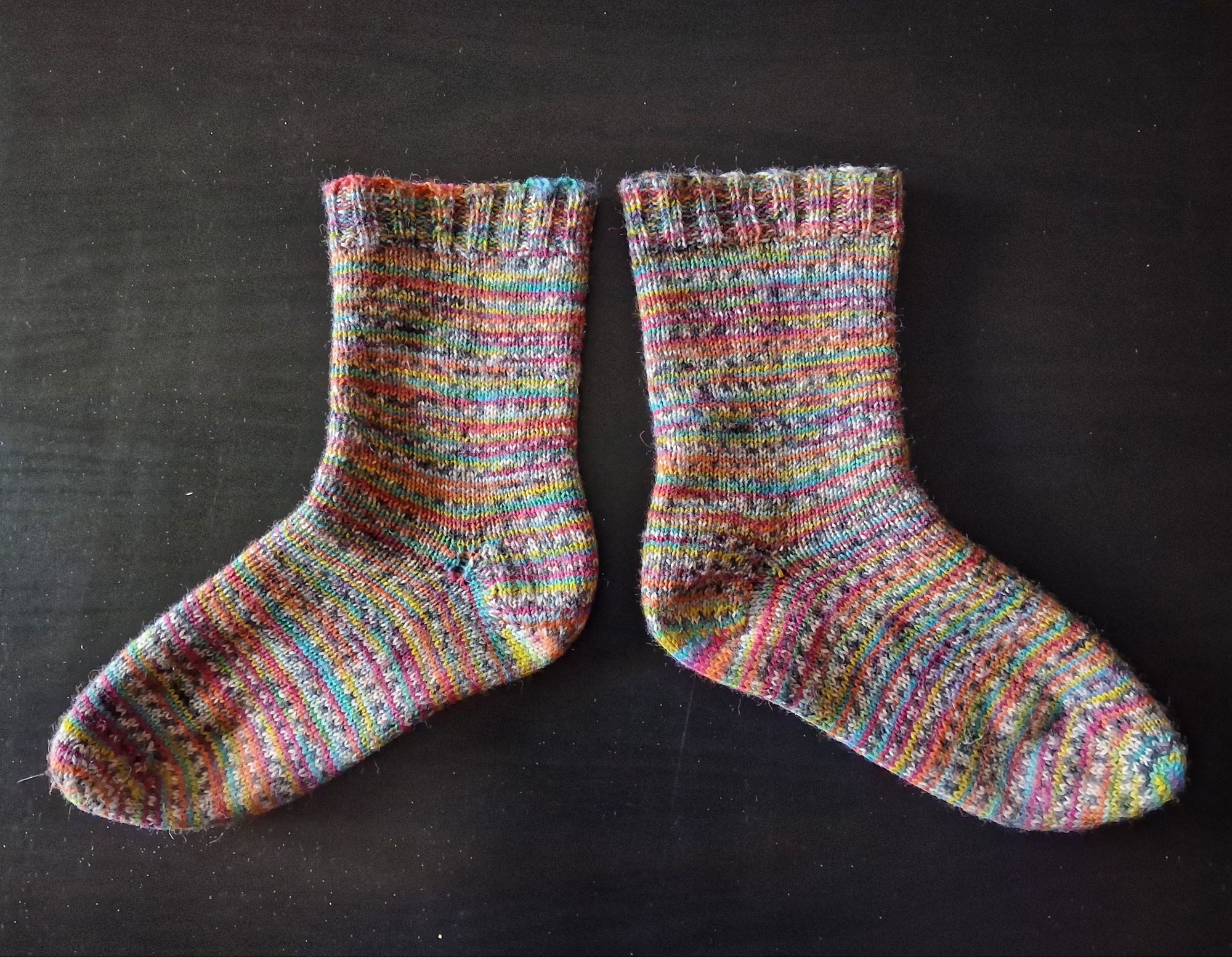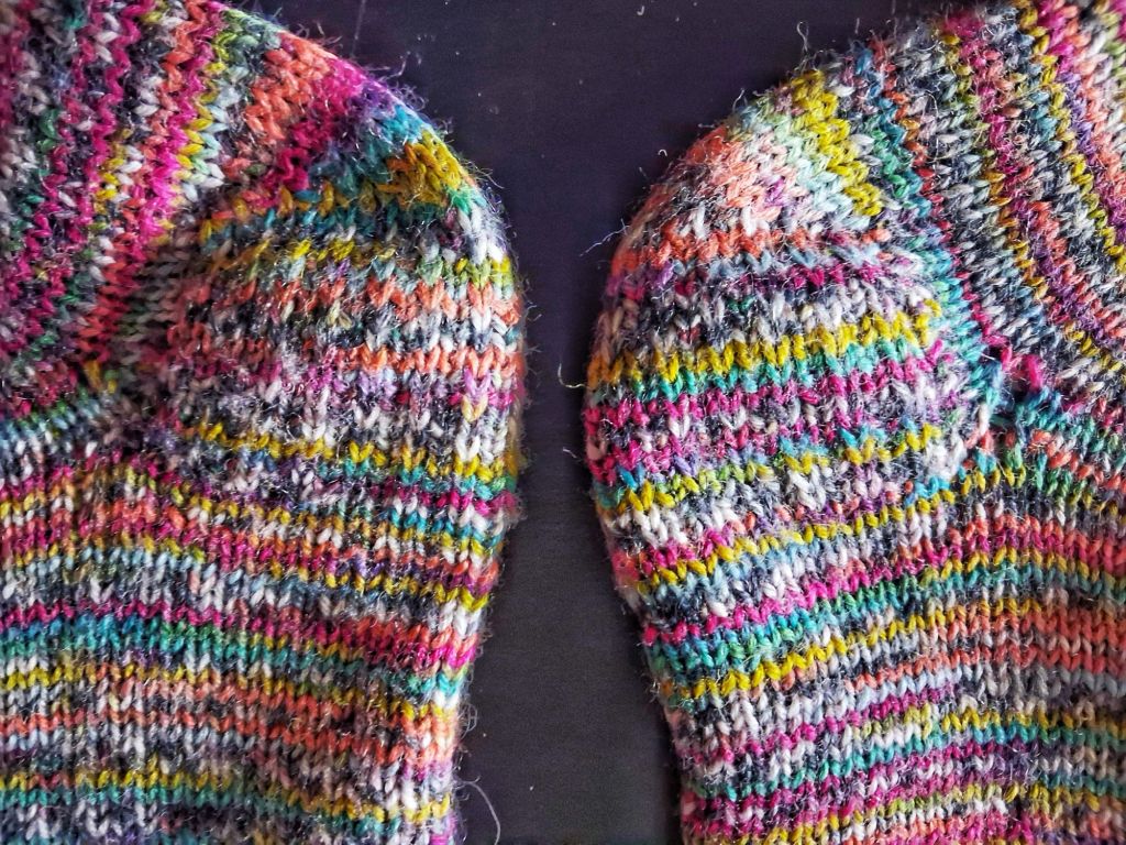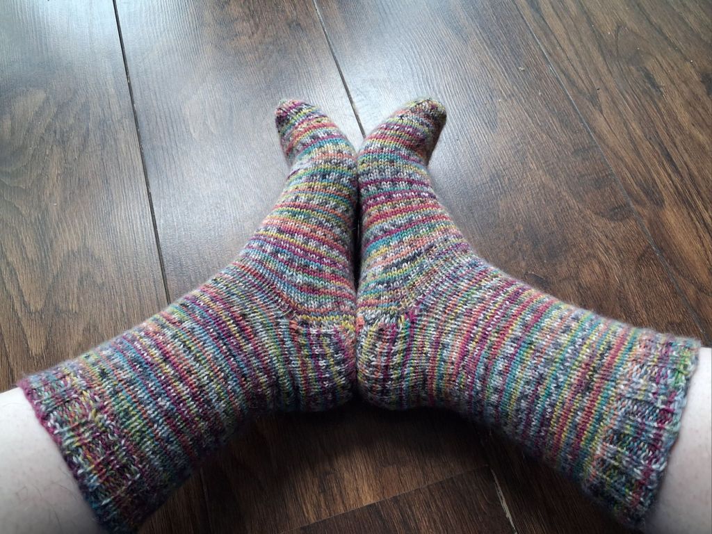 I wouldn’t say I’m now a dedicated sock knitter but I think it’s likely I’ll make another pair before too long. They were very satisfying to make, and looking at how neatly they fit my feet is very pleasing. But next time, perhaps a toe-up, and with contrasting heels and toes. What fun.