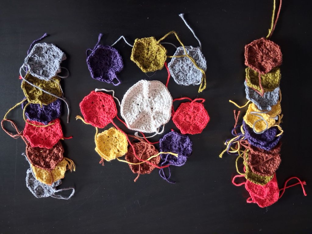 I’ve tried to use the colours roughly in proportion to the way they’re used in the scarf – with the sand colour being the most common (which is why I used it for joining, as well as the octagon on the underside and the tips of the tentacles. Yellow is least used, half as much as the sand. So there you go. Facts.