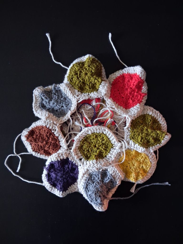 I changed the pattern by skipping the round that makes the shapes into flowers and changing the last round so that each peak has a double crochet, and each trough has a long stitch into the previous round, but the rest are singles. This left me with smaller, plainer shapes to put together.
