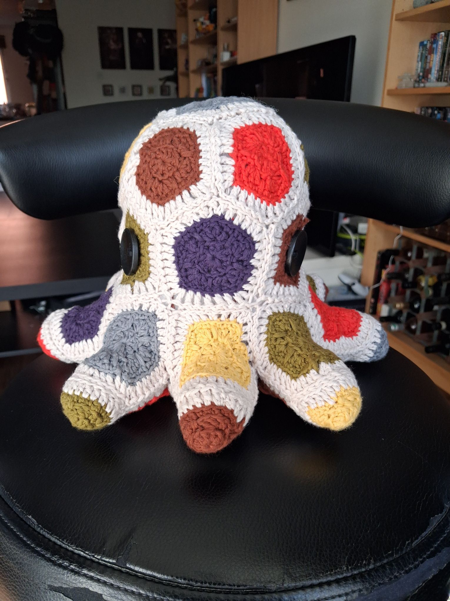 … except I’ve placed the eyes as recommended by the pattern, and I think he looks quite stern? I usually place them closer together. It’s certainly less cartoony and more like an actual octopus.